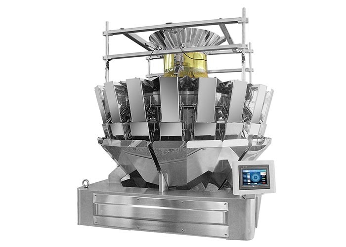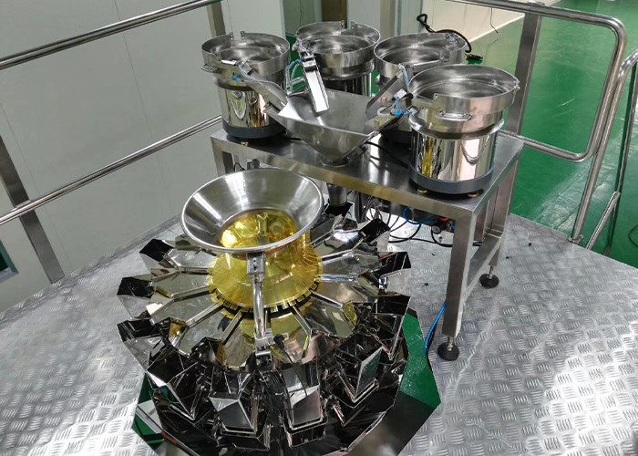 El peso objetivo típico por paquete (por ejemplo, 100 gramos) se logra mediante una tecnología de pesaje precisa.que depositan el producto en las tolvas de pesaje situadas debajo.