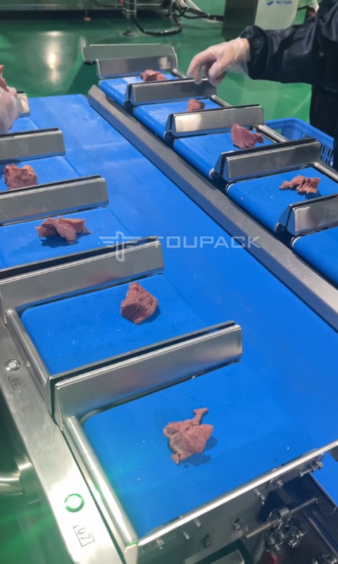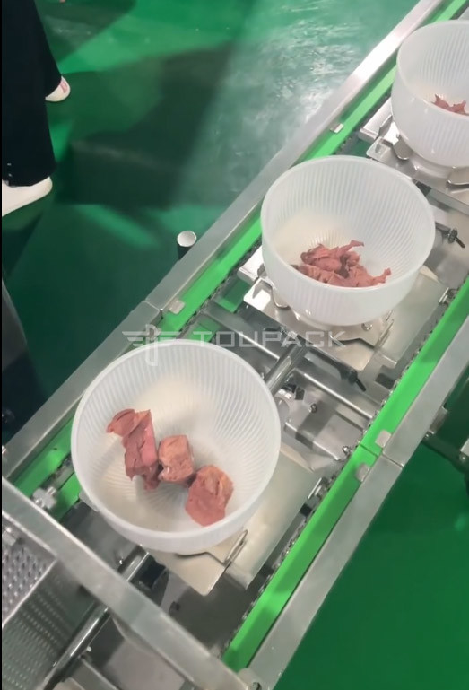 Nuestra máquina rotativa de embalaje de bolsas de vacío cuenta con un sistema de pesaje de 12 cabezas diseñado específicamente para el embalaje de cubos de carne.Los cubos de carne de res se transfieren a diferentes tolvas a través de múltiples transportadores de cinta, determinando el peso total del envase por los resultados combinados del pesaje.